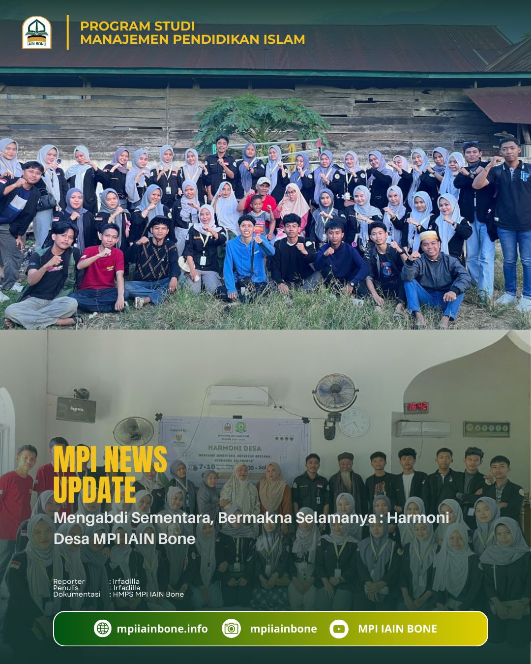 Bone, 10 Agustus 2025 – Himpunan Mahasiswa Program Studi (HMPS) Manajemen Pendidikan Islam (MPI) IAIN Bone sukses gelar kegaiatan harmoni desa, mahasiswa yang tergabung di HMPS MPI IAIN BONE melaksanakan kegiatan harmoni desa pada tanggal 07-10 Agustus 2025 di dusun …