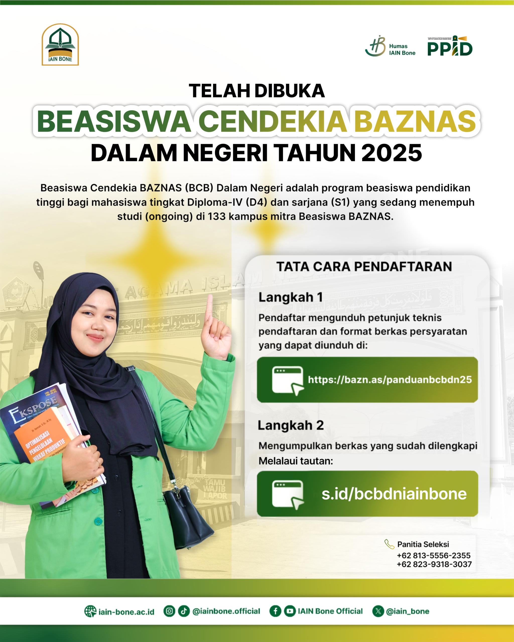 Kabar baik bagi mahasiswa IAIN Bone, pendaftaran Beasiswa Cendekia BAZNAS (BCB) tahun 2025 telah resmi dibuka. Program ini diperuntukkan bagi mahasiswa S1/D4 semester 5 dengan persyaratan memiliki IPK minimal 3,00 serta bersedia mengikuti pembinaan hingga akhir program. Adapun jadwal penting …